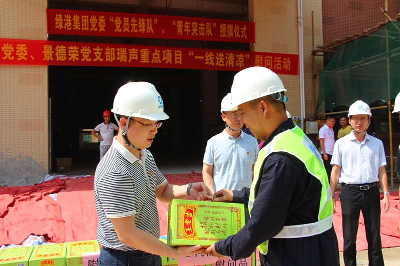 此次活動也是綠港集團(tuán)黨委在今年開展“四個一線”爭先鋒、創(chuàng)建黨建示范品牌工作以來,在項目建設(shè)一線開展創(chuàng)建“黨員攻堅先鋒隊”活動的重要舉措之一。“四個一線”是綠港集團(tuán)黨委圍繞經(jīng)開區(qū)黨工委加強(qiáng)基層黨建三年行動計劃,結(jié)合集團(tuán)公司項目建設(shè)、企業(yè)服務(wù)、招商銷售、項目融資的四個任務(wù),以“抓黨建促發(fā)展,抓品牌促提升”為主題,組織號召廣大黨團(tuán)員積極開展在項目一線創(chuàng)建“黨員攻堅先鋒隊”、在服務(wù)企業(yè)一線創(chuàng)建“服務(wù)示范標(biāo)兵(窗口)”、在招商銷售一線創(chuàng)建“一個黨員一面旗,我為綠港做代言”、在項目融資一線“爭做黨員領(lǐng)頭雁”的活動。活動開展以來,集團(tuán)黨建真正實(shí)現(xiàn)了“走前頭、作表率”的目標(biāo),引導(dǎo)集團(tuán)公司全體黨員干部轉(zhuǎn)變工作作風(fēng)、提高工作效能、強(qiáng)化服務(wù)意識,在促進(jìn)綠港集團(tuán)樹立國企黨建標(biāo)桿,不斷提升社會形象起到引領(lǐng)作用。授旗儀式結(jié)束后,綠港集團(tuán)與會領(lǐng)導(dǎo)還給項目一線參建人員送上了王老吉、西瓜水果等清涼慰問品,鼓勵他們繼續(xù)發(fā)揚(yáng)綠港鐵軍精神,急難險重顯身手,同時要注意防暑降溫、保重身體,更好地為項目建設(shè)做貢獻(xiàn)。(綠港集團(tuán) 陽正輝、張彩秀/文、圖)