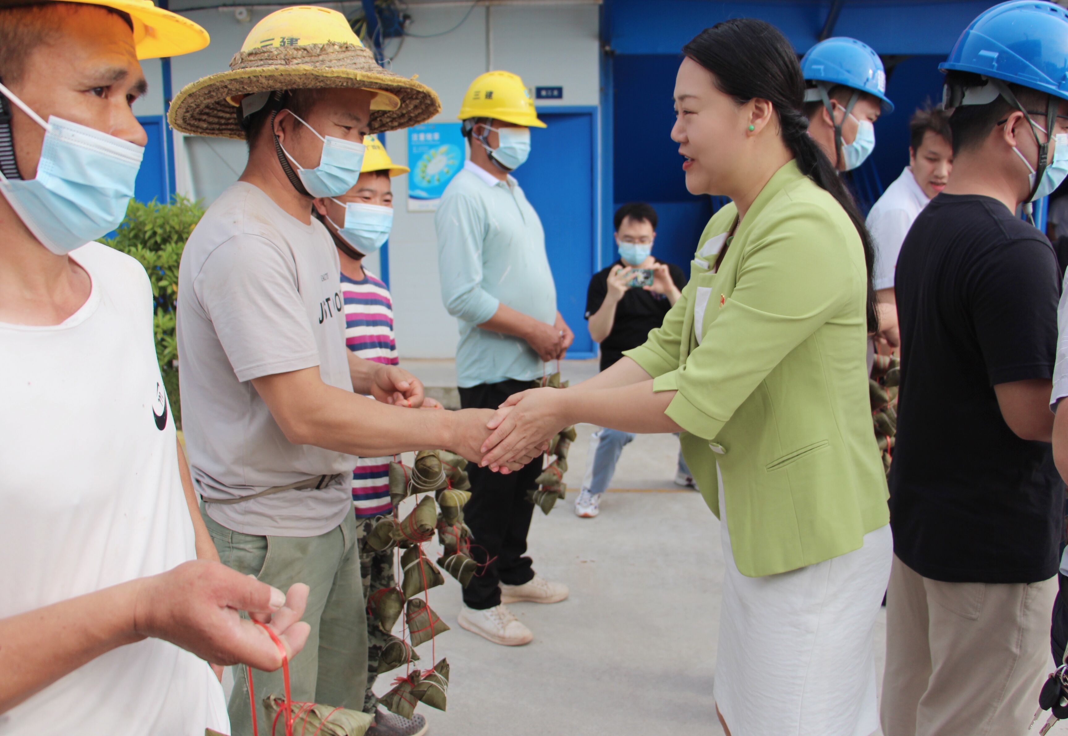 關(guān)心關(guān)懷進(jìn)工地,濃濃粽情暖人心。座談會(huì)后,此次聯(lián)建的各黨支部相關(guān)領(lǐng)導(dǎo)共同慰問(wèn)了項(xiàng)目一線工人,為他們送去粽子等慰問(wèn)品和最真摯的節(jié)日問(wèn)候,感謝一線工人的辛勤勞動(dòng)、敬業(yè)付出以及為綠港?金陽(yáng)產(chǎn)業(yè)城等南寧市重點(diǎn)項(xiàng)目建設(shè)做出的貢獻(xiàn)。慰問(wèn)中,綠港集團(tuán)黨委委員、副總經(jīng)理黃麗琴關(guān)切地詢問(wèn)現(xiàn)場(chǎng)工人勞動(dòng)安全保障情況和防疫情況,叮囑大家要注意勞動(dòng)安全,防疫安全,堅(jiān)持安全與生產(chǎn)兩手抓兩不誤,希望大家繼續(xù)保持昂揚(yáng)的斗志,以高度的責(zé)任感和飽滿的工作熱情投身項(xiàng)目建設(shè)中,經(jīng)開區(qū)社會(huì)經(jīng)濟(jì)高質(zhì)量發(fā)展作出貢獻(xiàn)。