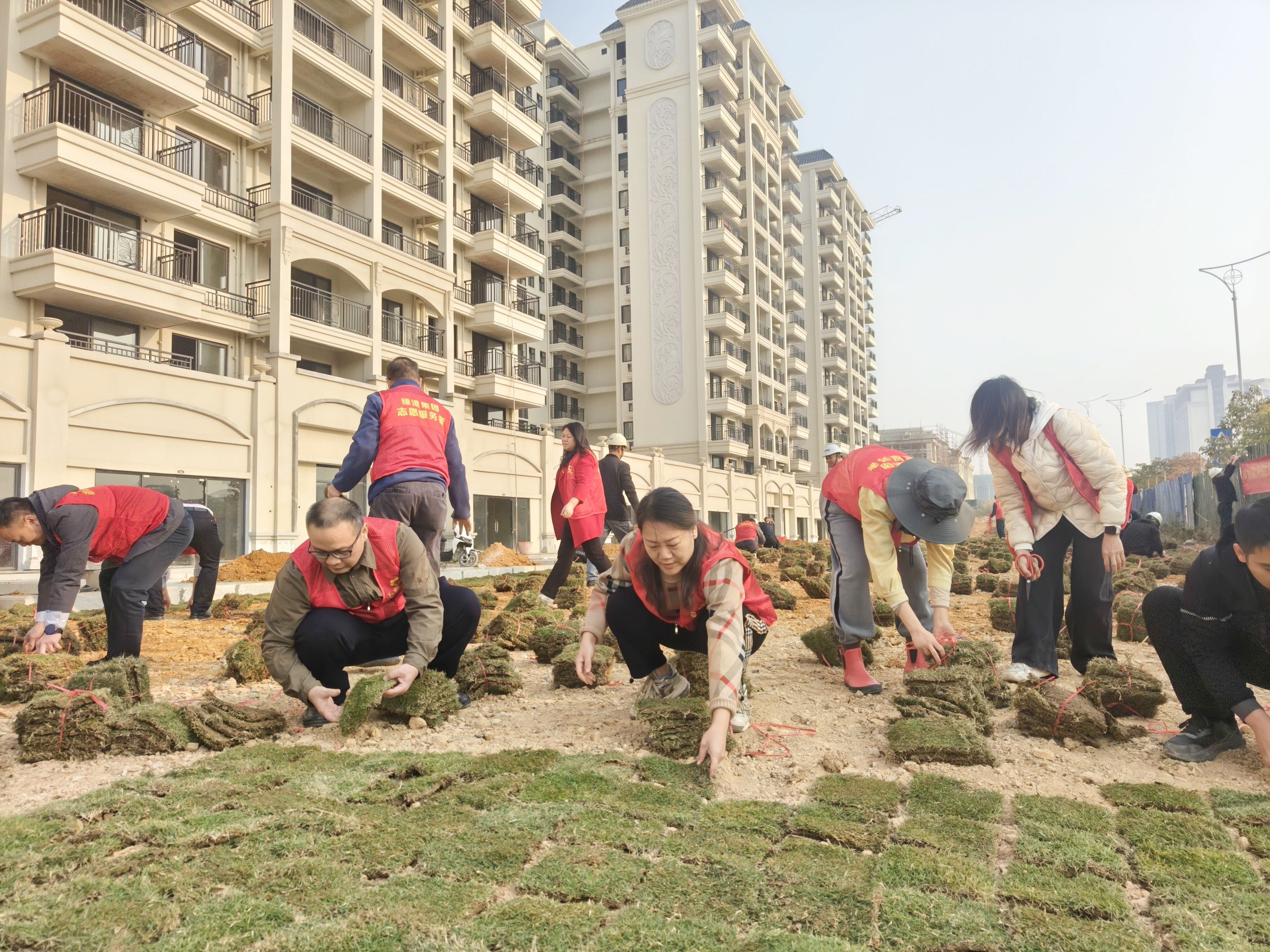 號角既已吹起,行動便無止息。活動中,緊張有序的項目施工現(xiàn)場,呈現(xiàn)出一派熱火朝天的景象。嘉通公司黨支部、榮鑫公司黨支部的黨員及入黨積極分子們以身作則,與施工人員并肩作戰(zhàn),身著志愿者服裝,精神抖擻地投入到草坪鋪植工作中。大家各司其職、分工明確,齊心協(xié)力,有的負責搬運草皮,有的進行地面平整,有的仔細鋪設草皮,有的負責澆水養(yǎng)護,每一個環(huán)節(jié)都嚴謹認真、有條不紊,確保施工工程質(zhì)量和效果經(jīng)得起檢驗。經(jīng)過全員共同努力,短短3個小時,共完成了鋪植草皮50000塊,草坪面積共計2000㎡,呈現(xiàn)一派生機盎然,切實以實際行動踐行初心使命,為項目“保交付”的順利推進提供了堅實保障。
